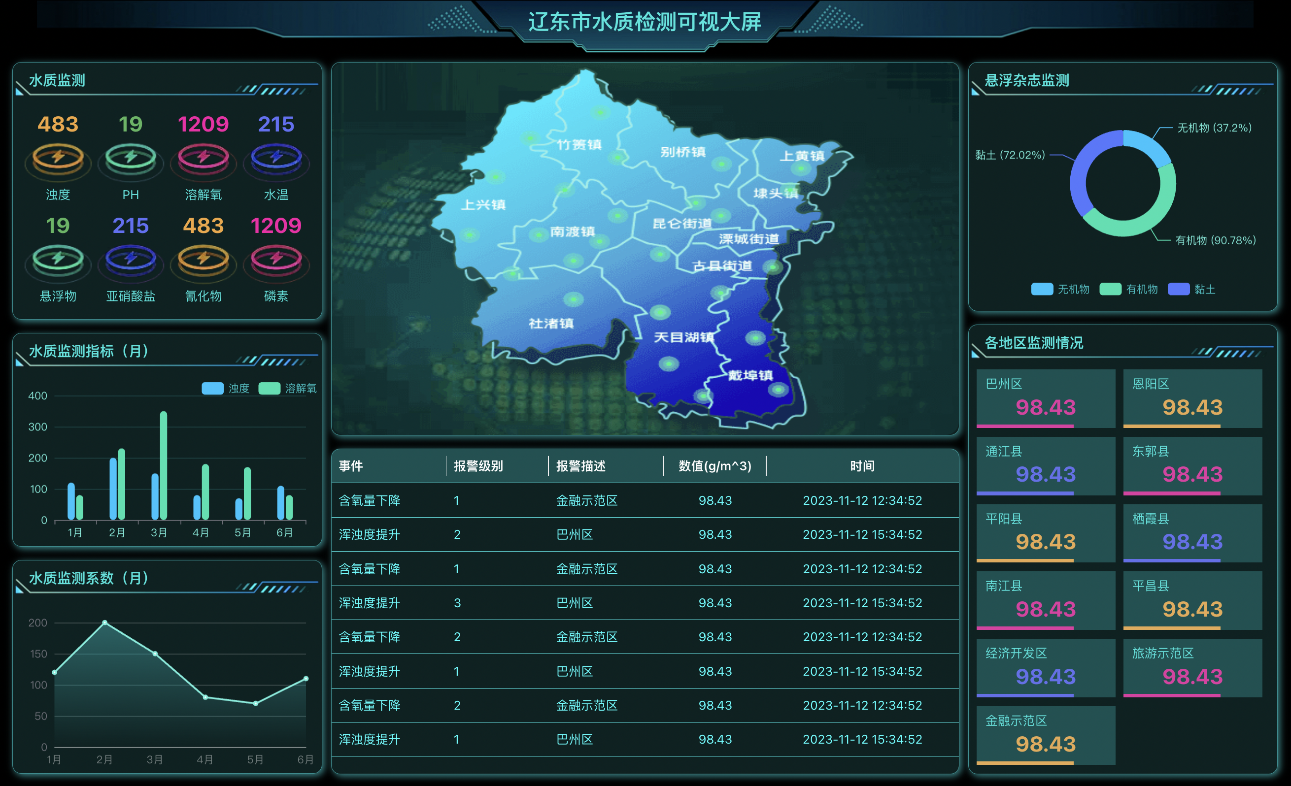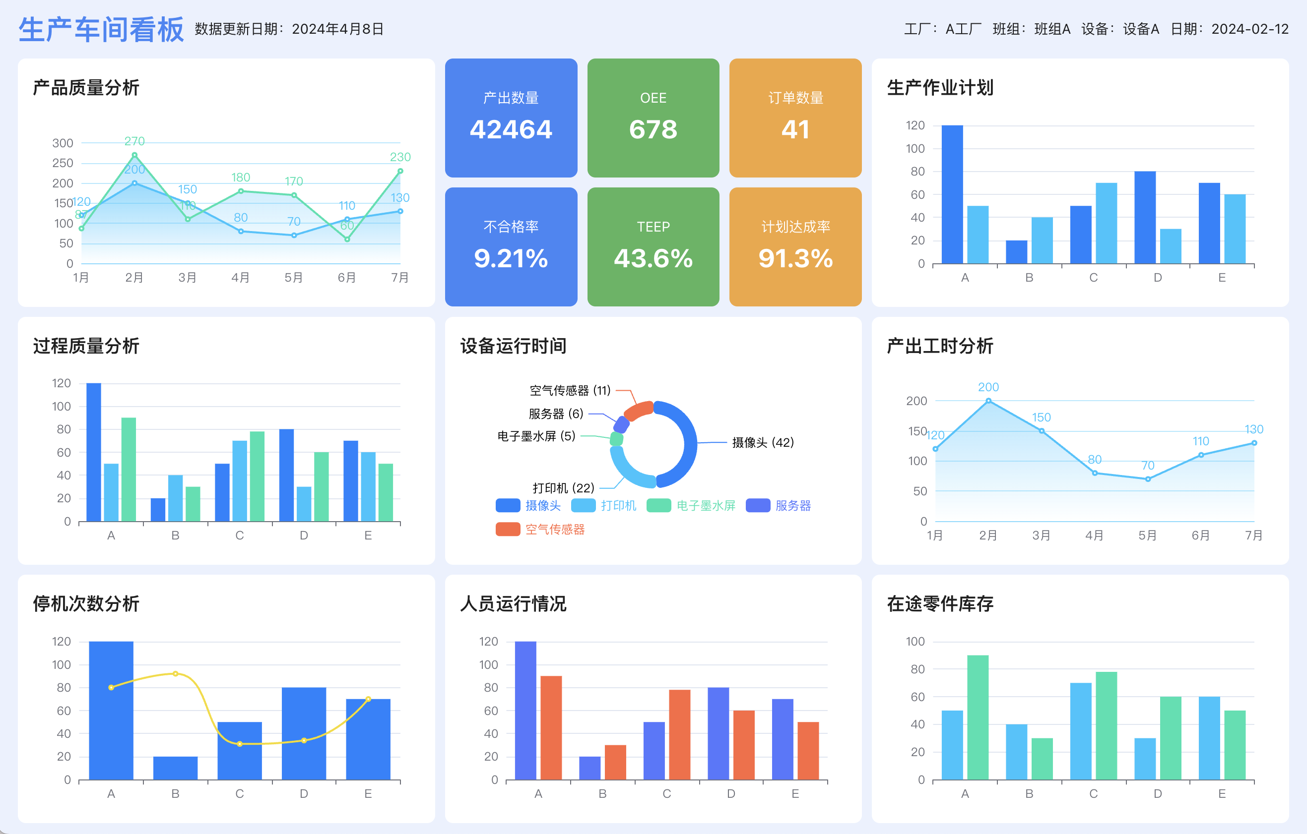 生产车间看板可以统计汇总当前车间生产情况,管理层通过该看板来协助决策。看板包含:产出数量,OEE,订单数量,不合格率,TEEP,计划达成率,产品质量分析,生产作业计划,过程质量分析,设备运行时间,产出工时分析,待机次数分析,人员运行情况,在途零件库存等指标。(数据已脱敏)