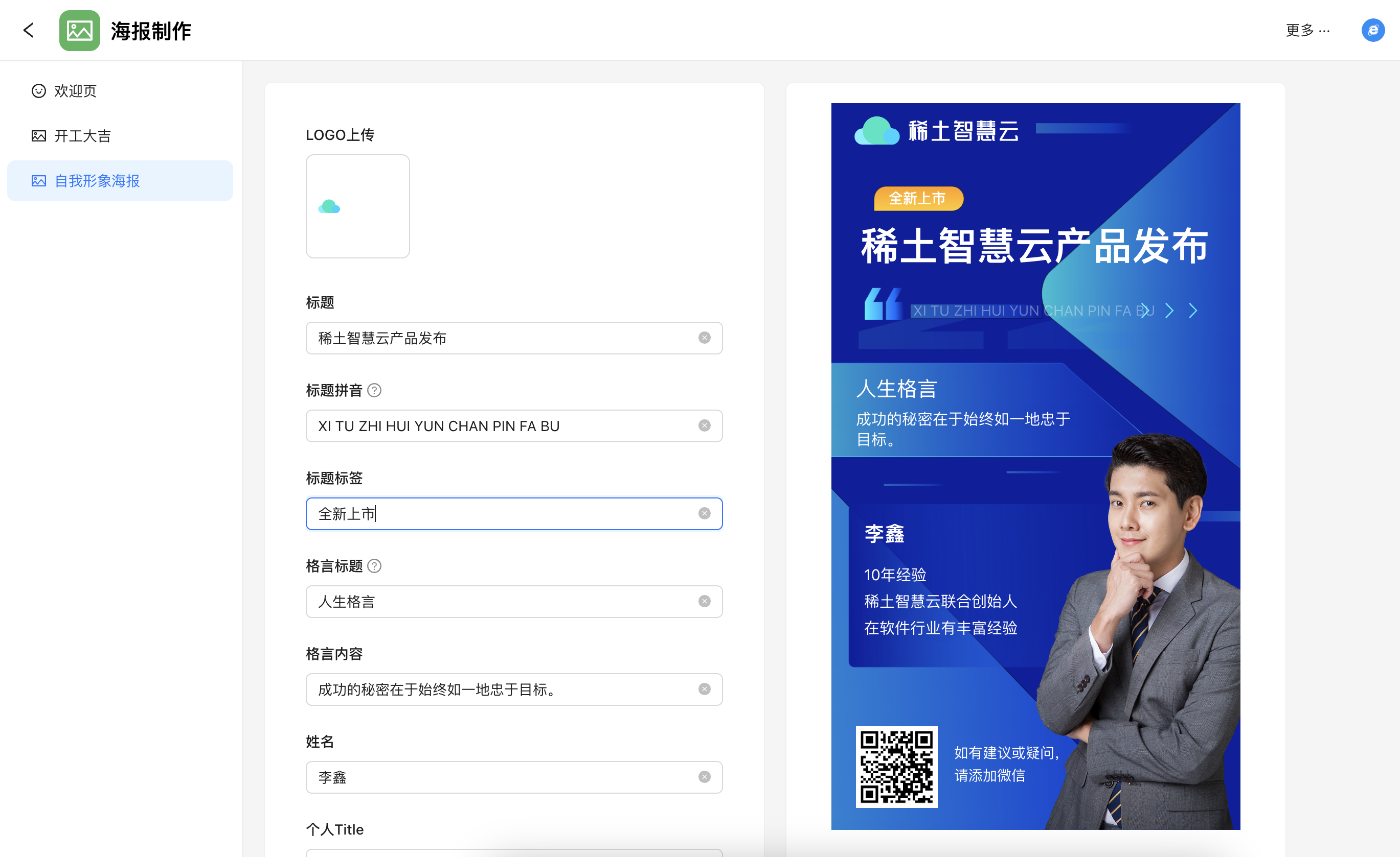 海报制作是一款海报DIY工具,您可以通过简单的文字配置即可生成精美的海报。工具提供丰富的设计元素和编辑功能,满足不同需求。用户可以自由定制海报风格,快速生成高质量的宣传海报,帮助企业吸引目标客户,提升品牌曝光度。支持下载到本地使用。