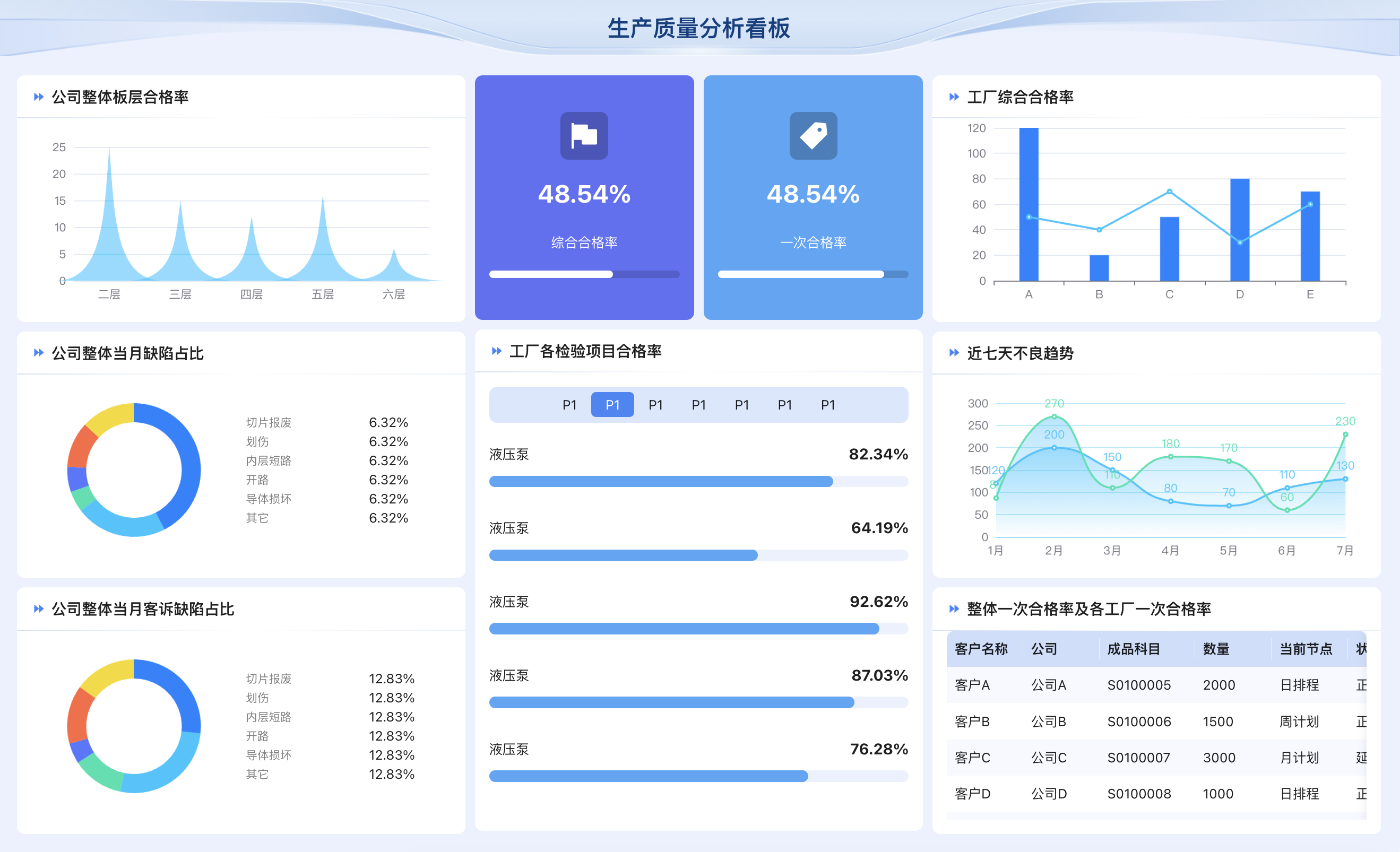 立即使用生产质量分析看板汇总当前订单生产质量的综合统计情况,对及时发现质量问题,提升产品合格率有极大帮助。该看板包含以下指标:综合合格率,一次合格率,公司整体板层合格率,公司整体当月缺陷占比,公司整体当月客户缺陷占比,工厂各检验项目合格率,工厂综合合格率,近七天不良趋势,整体一次合格率及各工厂一次合格率。
