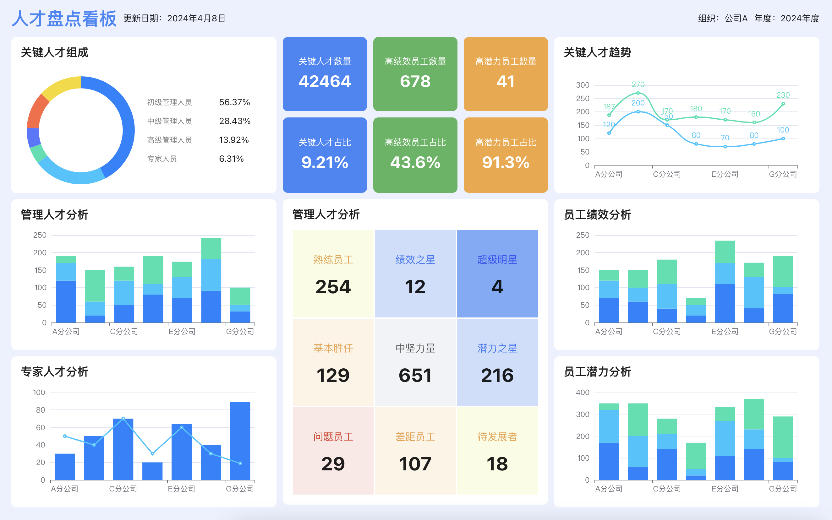立即使用人才盘点看板对大型企业的人才储备管理有很大的帮助,通过人才盘点看板,可以明确公司成员的各项指标,为公司战略人才储备提供有力的支撑。该看板指标有:管理人才分析,专家人才分析,关键人才趋势,员工绩效分析,员工潜力分析等。