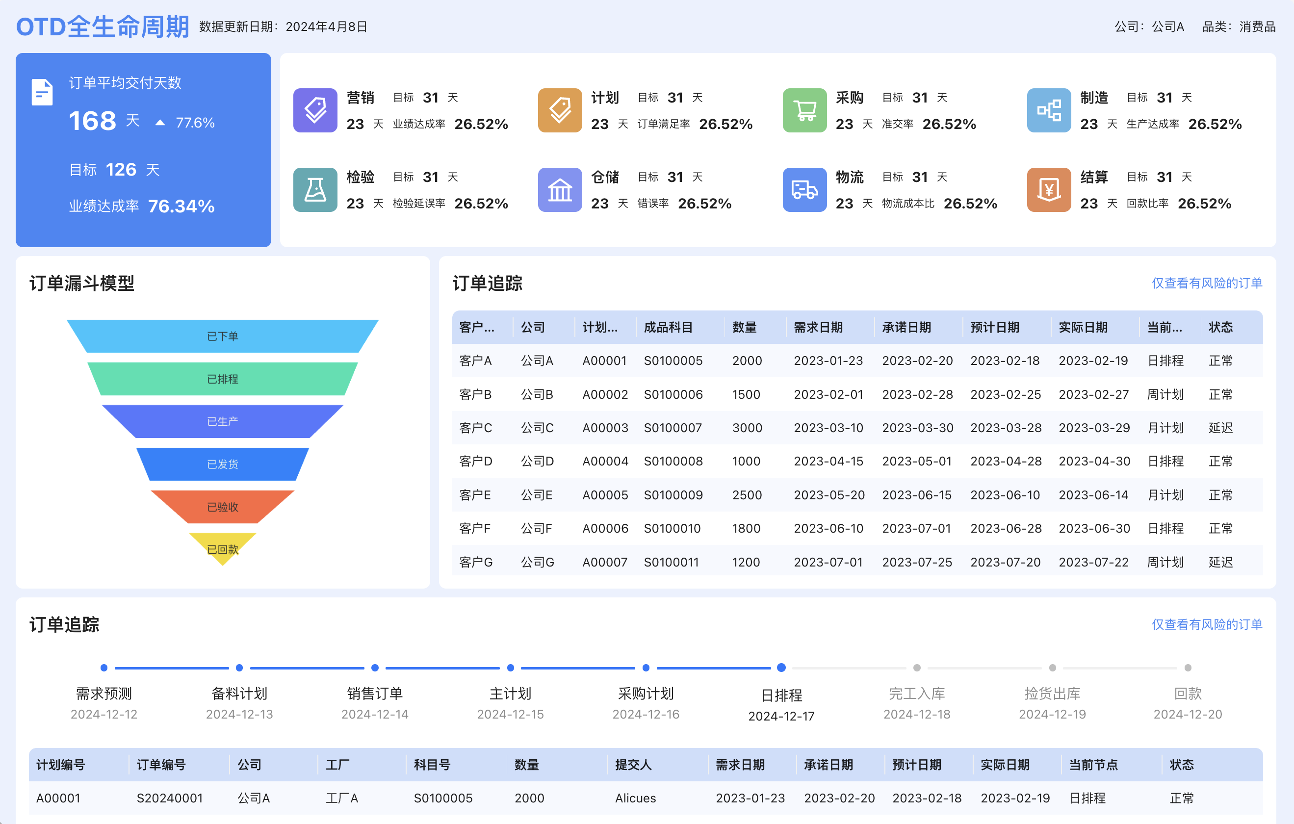 立即使用OTD全生命周期看板为企业生产情况提供直观的展示,从需求对接,备料,到生产,入库,发货,回款的全流程智能把控。看板从:营销,计划,采购,制造,检验,仓储,物流,结算8个方面给出跟踪。该看板还包括如下指标:订单漏斗模型,订单追踪,生产追踪等实时查看生产进度。
